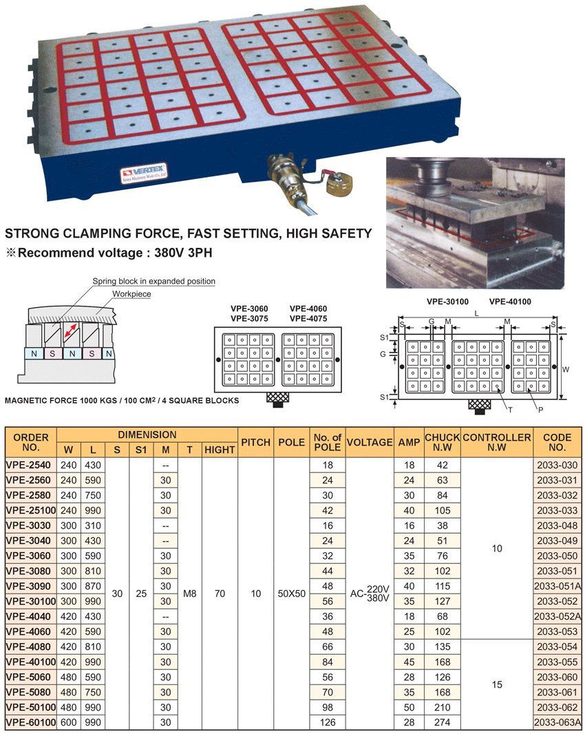 6. Bàn từ điện máy phay VPE-2540, VPE-2560, VPE-2580, VPE-25100, VPE-3030, VPE-3040, VPE-3060, VPE-3080, VPE-3090, VPE-30100, VPE-4040, VPE-4060, VPE-4080, VPE-40100, VPE-5060, VPE-5080, VPE-50100, VPE-60100 của VERTEX: