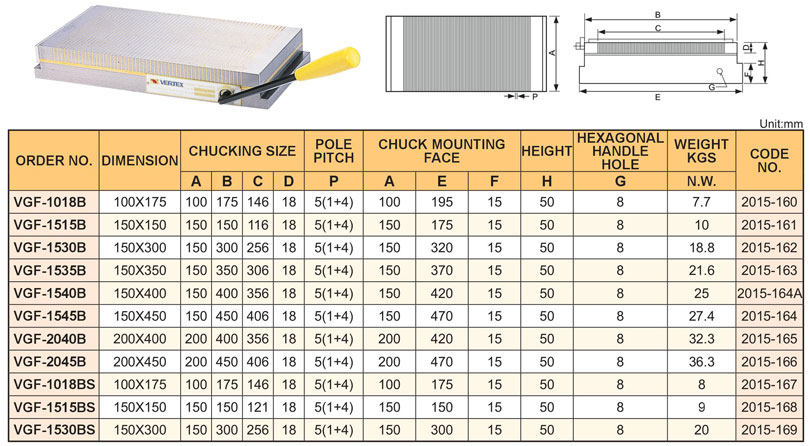 2. Bàn từ máy mài bước cực từ trung bình VGF-1018B, VGF-1515B, VGF-1530B, VGF-1535B, VGF-1540B, VGF-1545B, VGF-2040B, VGF-2045B, VGF-1018BS, VGF-1515BS, VGF-1530BS của VERTEX: