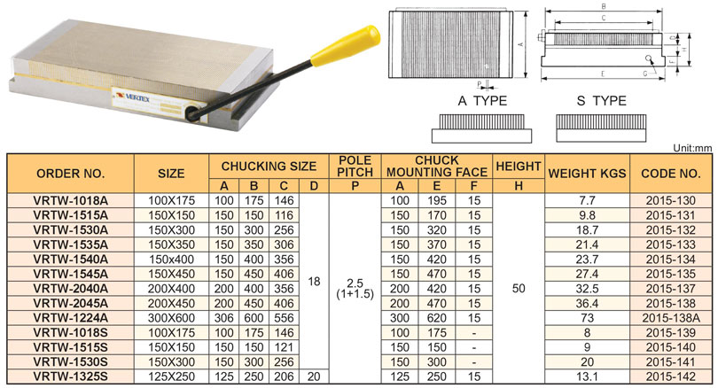 3. Bàn từ máy mài bước cực từ nhỏ VRTW-1018A, VRTW-1515A, VRTW-1530A, VRTW-1535A, VRTW-1540A, VRTW-1545A, VRTW-2040A, VRTW-2045A, VRTW-1224A, VRTW-1018S, VRTW-1515S, VRTW-1530S, VRTW-1325S của VERTEX: