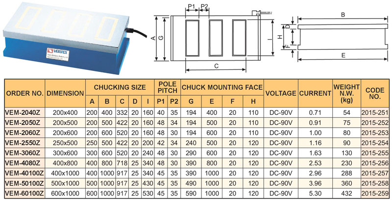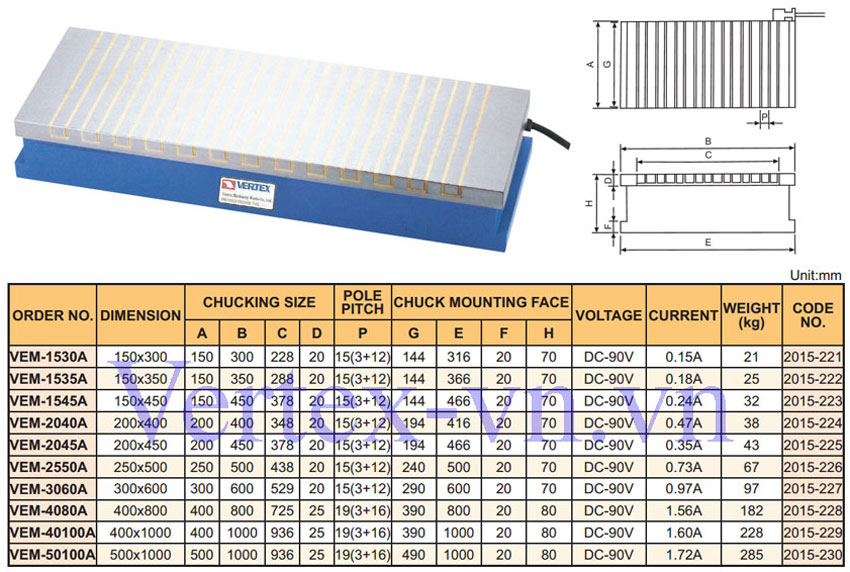 4. Bàn từ máy mài điện VEM-1530A, VEM-1535A, VEM-1545A, VEM-2040A, VEM-2045A, VEM-2550A, VEM-3060A, VEM-4080A, VEM-40100A, VEM-50100A của VERTEX:
