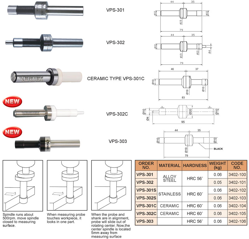 – Dòng cảm biến tiếp xúc VPS-201, VPS-201C cho thiết lập chính xác cao vị trí giữa tâm dụng cụ và bề mặt tham chiếu của phôi với giá thành thấp và thời gian thiết lập nhanh.