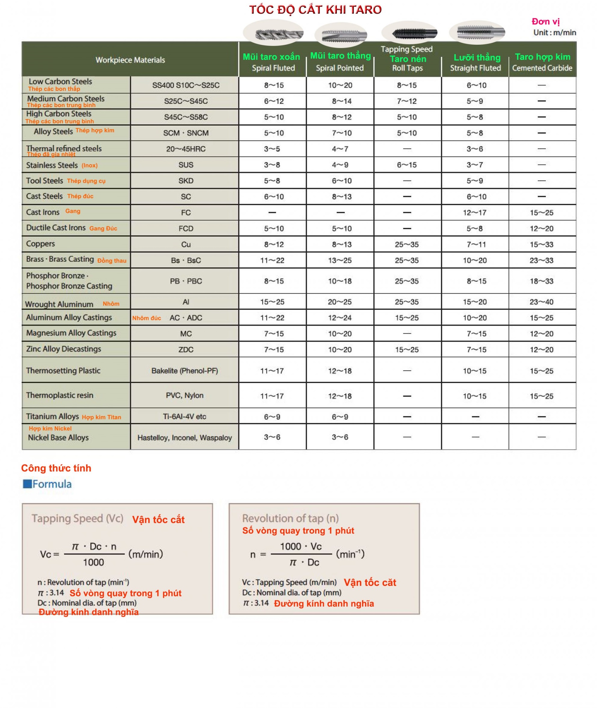 Tốc độ cắt ren không chỉ ảnh hưởng tới bước ren mà còn có thể làm hư hỏng mũi taro. Tốc độ cắt ren phụ thuộc vào nhiều yếu tố khác nhau, để chọn được tốc độ cắt ren đúng chuẩn mời các bạn tham khảo bảng tra tốc độ cắt khi taro dưới đây. Những mốc tốc độ sau đây dành cho điều kiện cắt khi dùng dầu cắt không hòa tan. Khi sử dụng dầu cắt hòa tan được trong nước thì xin hãy giảm bớt đi 30% tốc độ cắt.