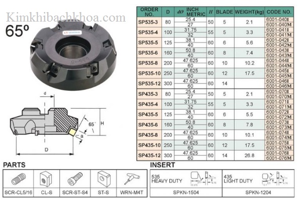 Đài dao phay khỏa mặt 65° của VERTEX: SP535-3, SP535-4, SP535-5, SP535-6, SP535-8, SP535-10, SP535-12, SP435-3, SP435-4, SP435-5, SP435-6, SP435-8, SP435-10, SP435-12 được sử dụng phay phẳng bề mặt chi tiết trên máy phay và trung tâm gia công.