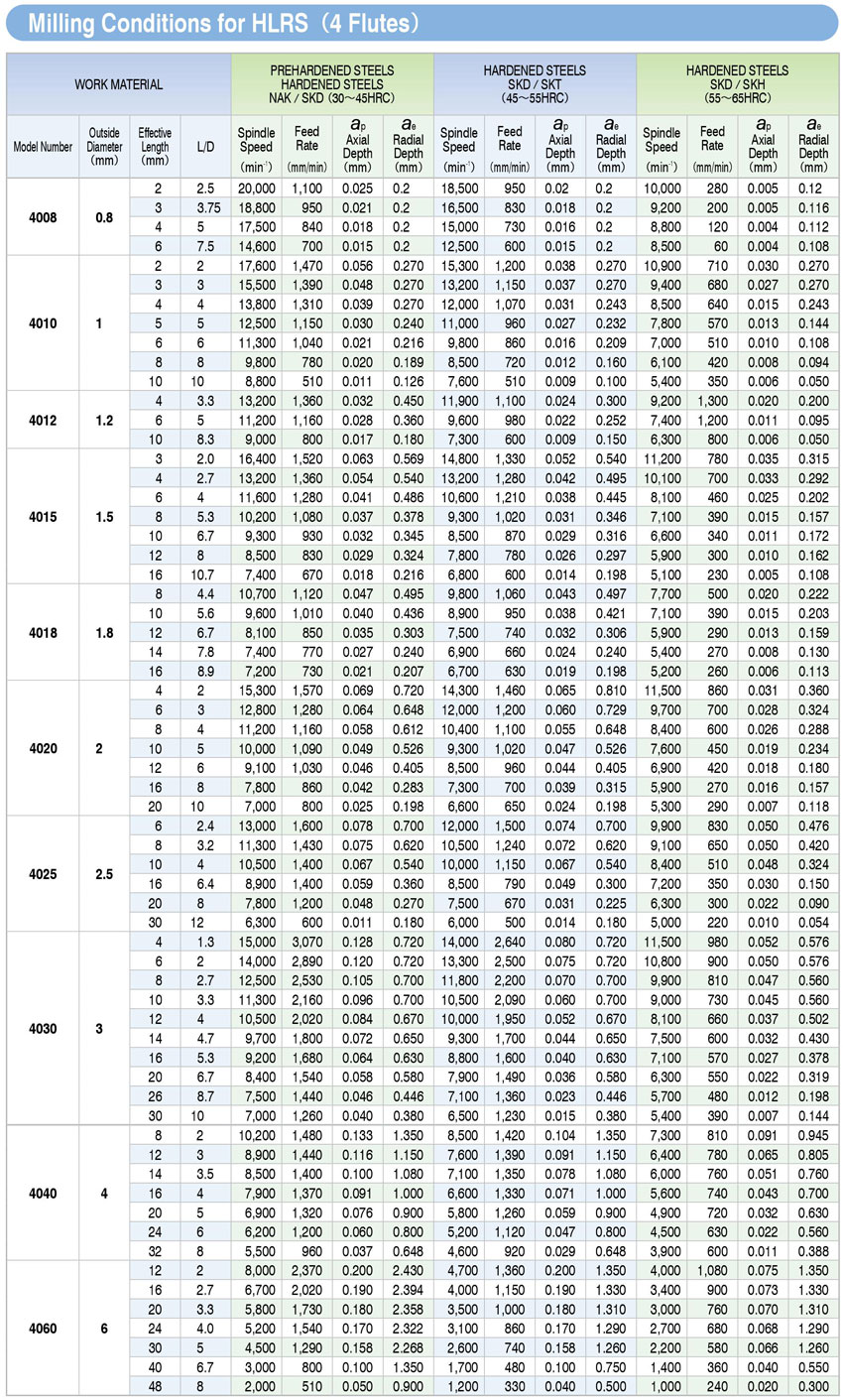 * Chế độ cắt dao phay góc cổ dài hợp kim HLRS4000: