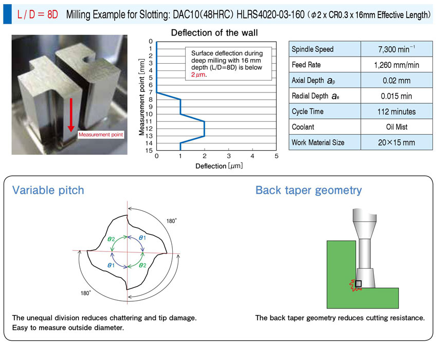 – Quá trình phay rãnh sâu gấp 8 lần đường kính (L/D = 8D), vật liệu DAC10 (48HRC) của dao phay HLRS4020-03-160 (Φ2 x CR0.3 x 16l1):