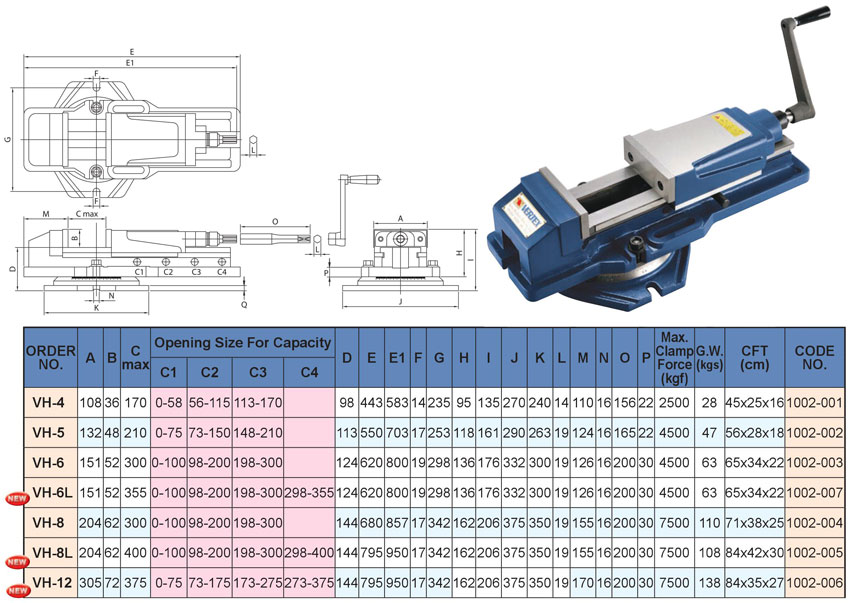 – Ê tô thủy lực VH khi đặt hàng đã bao gồm đế xoay 360°. Các model ê tô thủy lực VH khi mua không bao gồm đế tương ứng là: VH-4-1, VH-5-1, VH-6-1, VH-6L-1, VH-8-1, VH-8L-1, VH-12-1.