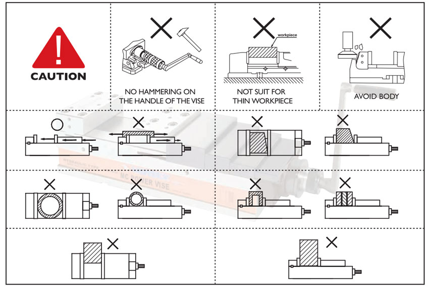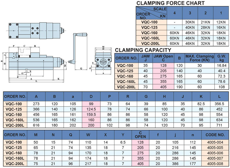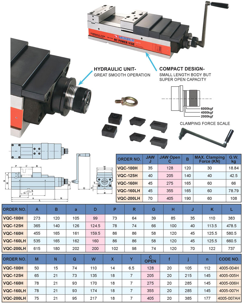 – Ê tô thủy lực VQC-H có 3 vạch điều chỉnh lực thủy lực. Tỉ lệ mỗi vạch là 1/3 lực kẹp lớn nhất. Lực kẹp lớn nhất tra theo bảng của sản phẩm.
