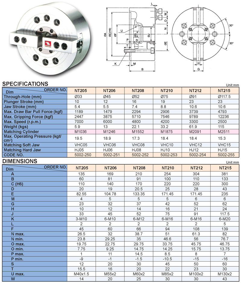 Mâm cặp thủy lực 2 chấu lỗ thông NT205, NT206, NT208, NT210, NT212, NT215 của VERTEX: