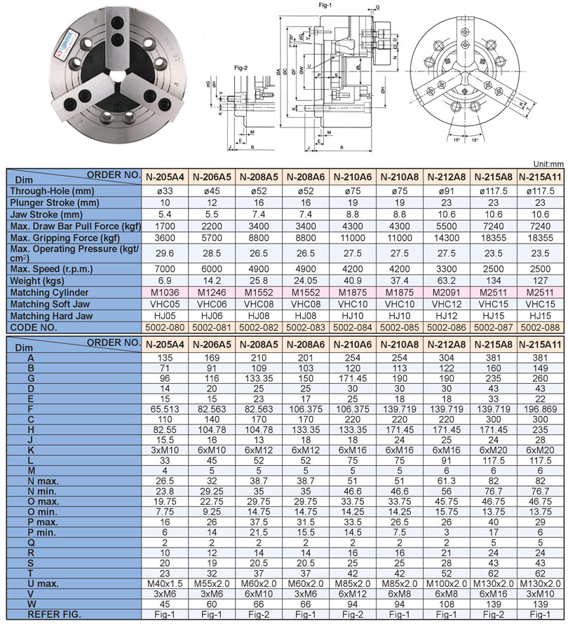 – Mâm cặp thủy lực N-200A lắp với đầu nối trục chính kiểu ASA B5.9.