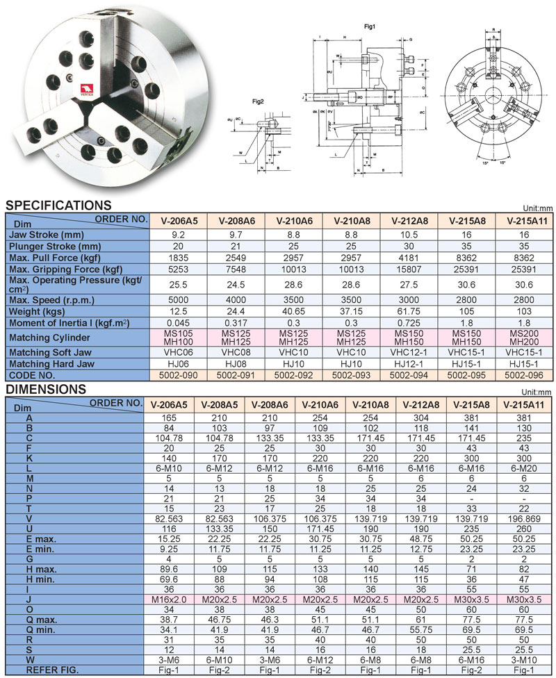 Mâm cặp thủy lực 3 chấu lỗ không thông V-206A5, V-208A6, V-210A6, V-210A8, V-212A8, V-215A8, V-215A11 của VERTEX: