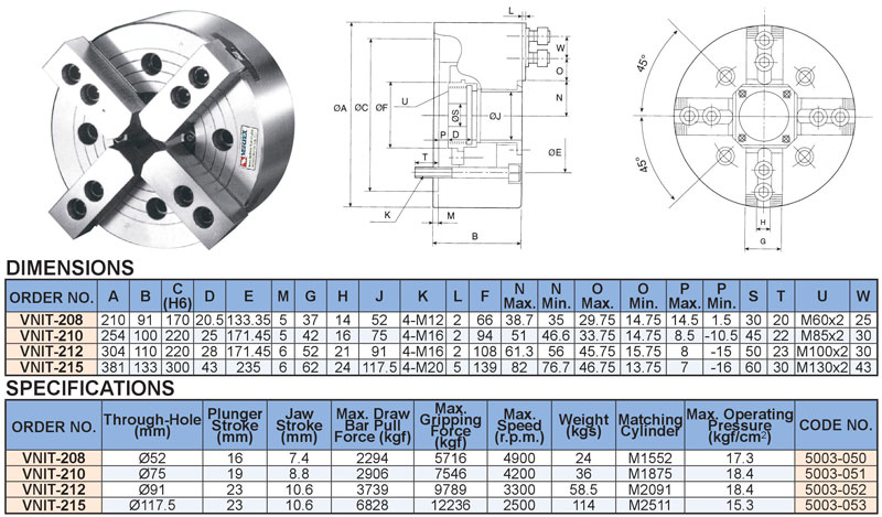 Mâm cặp thủy lực 4 chấu lỗ thông VNIT-208, VNIT-210, VNIT-212, VNIT-215 của VERTEX: