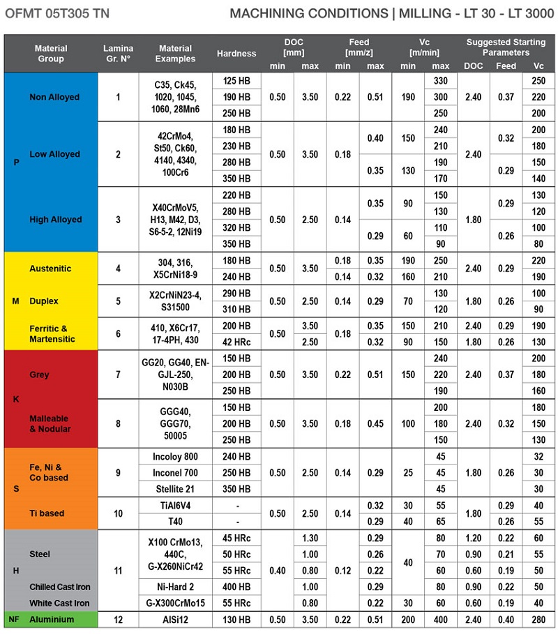 Chíp phay OFMT thích hợp cho từ phay thô đến phay tinh, phay rãnh, phay cạnh đứng và phay khỏa mặt xuống dần.