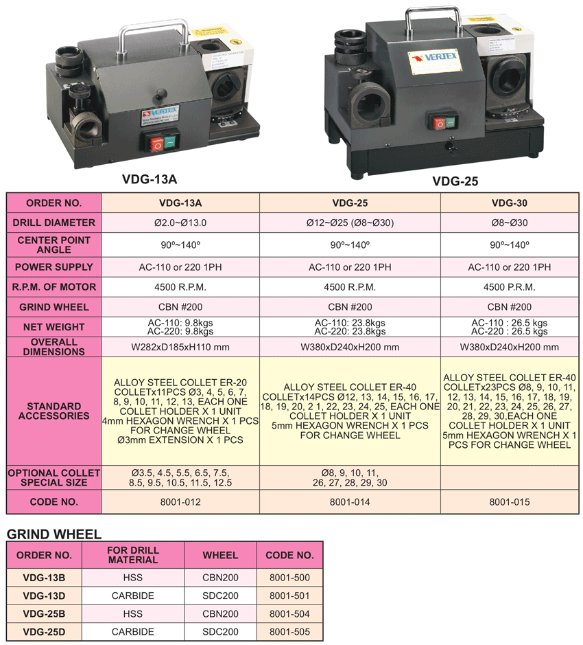 Đặc tính thông số sản phẩm máy mài mũi khoan chuyên dụng VDG-13A, VDG-25, VDG-30 của Vertex: